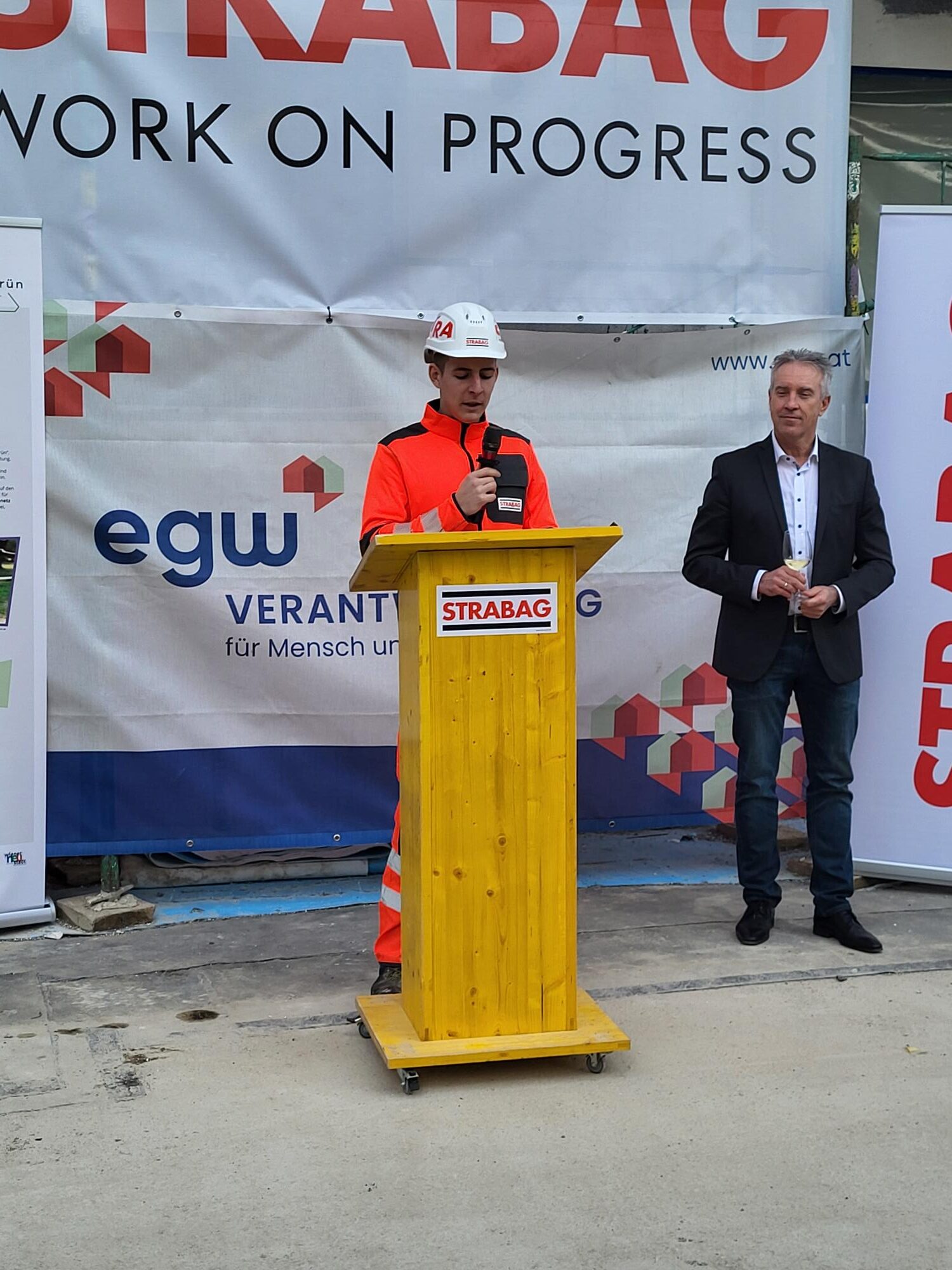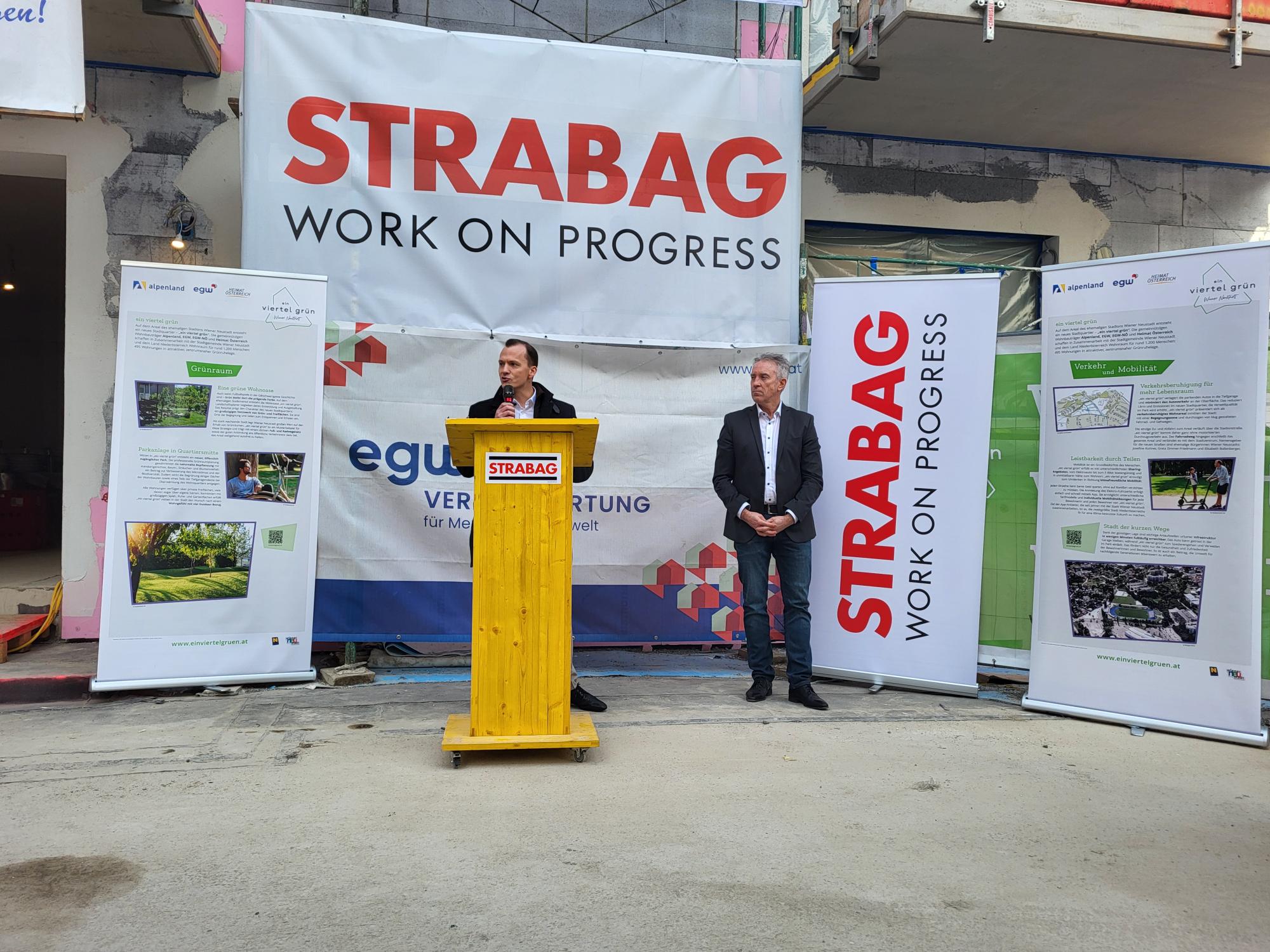 Gemeinsam mit den Projektpartnern feierte die EGW Ende Februar 2026 die Dachgleiche für das Baufeld 2 und erreichte somit einen weiteren Meilenstein im Wohnquartier ein viertel grün in Wiener Neustadt.